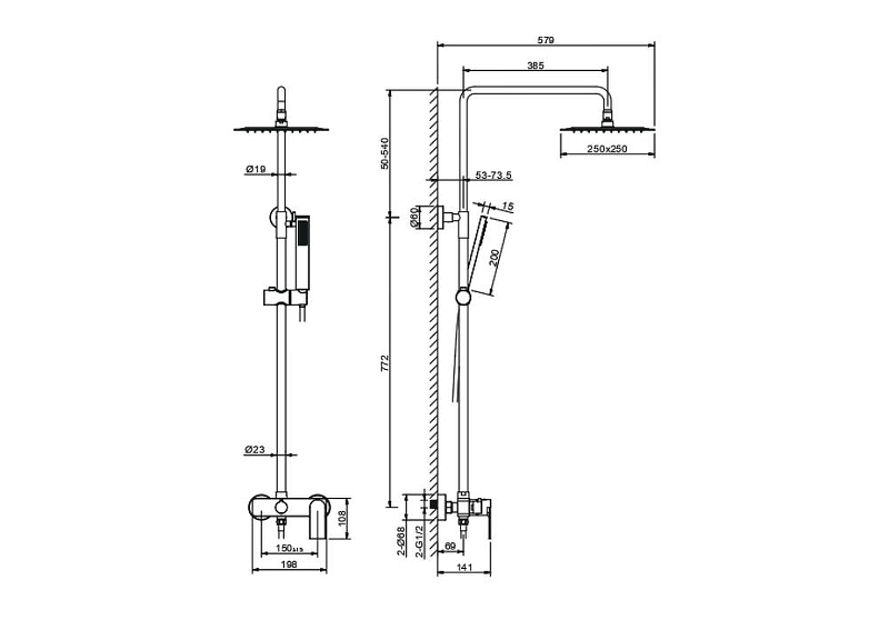Материал корпуса - латунь на 2 потребителя картридж sedal 35 мм (испания) душевая колонна из нерж. φ23 мм верхний душ из нерж. 250*250*2 мм ручной душ из латуни 1 функц. шланг для душа из нерж 1,5 м преключатель - керамический дивертор упакован в цветн. коробку со вставками из пены пвх