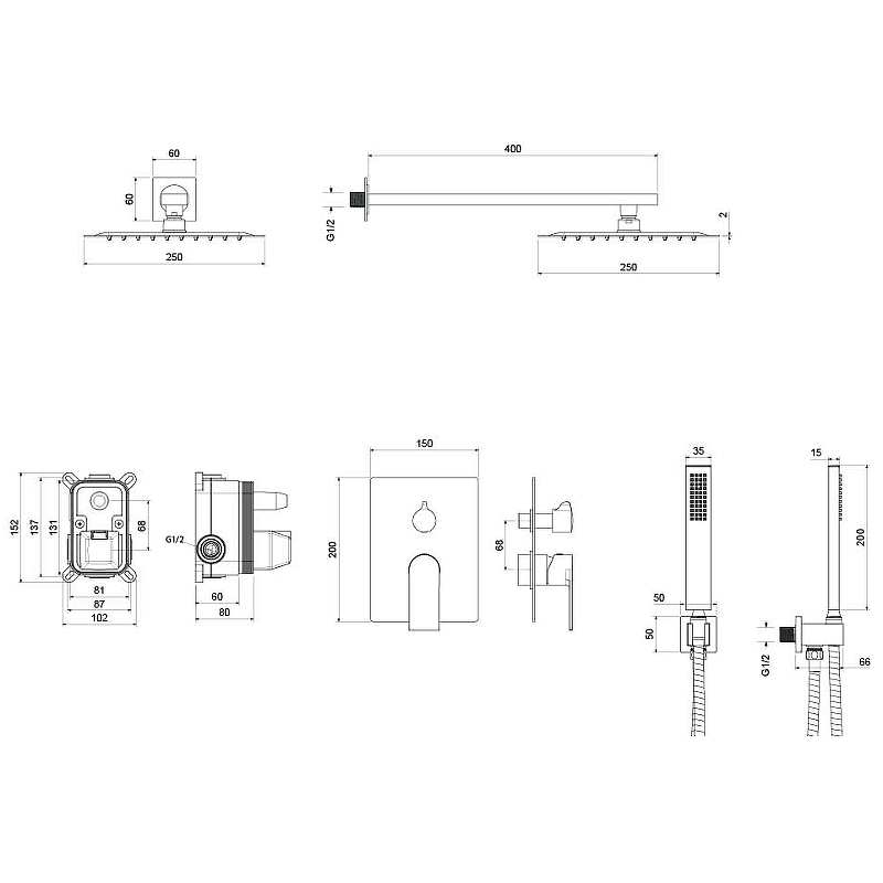 - Размер верхнего душа (ШхД): 250х250 мм.
