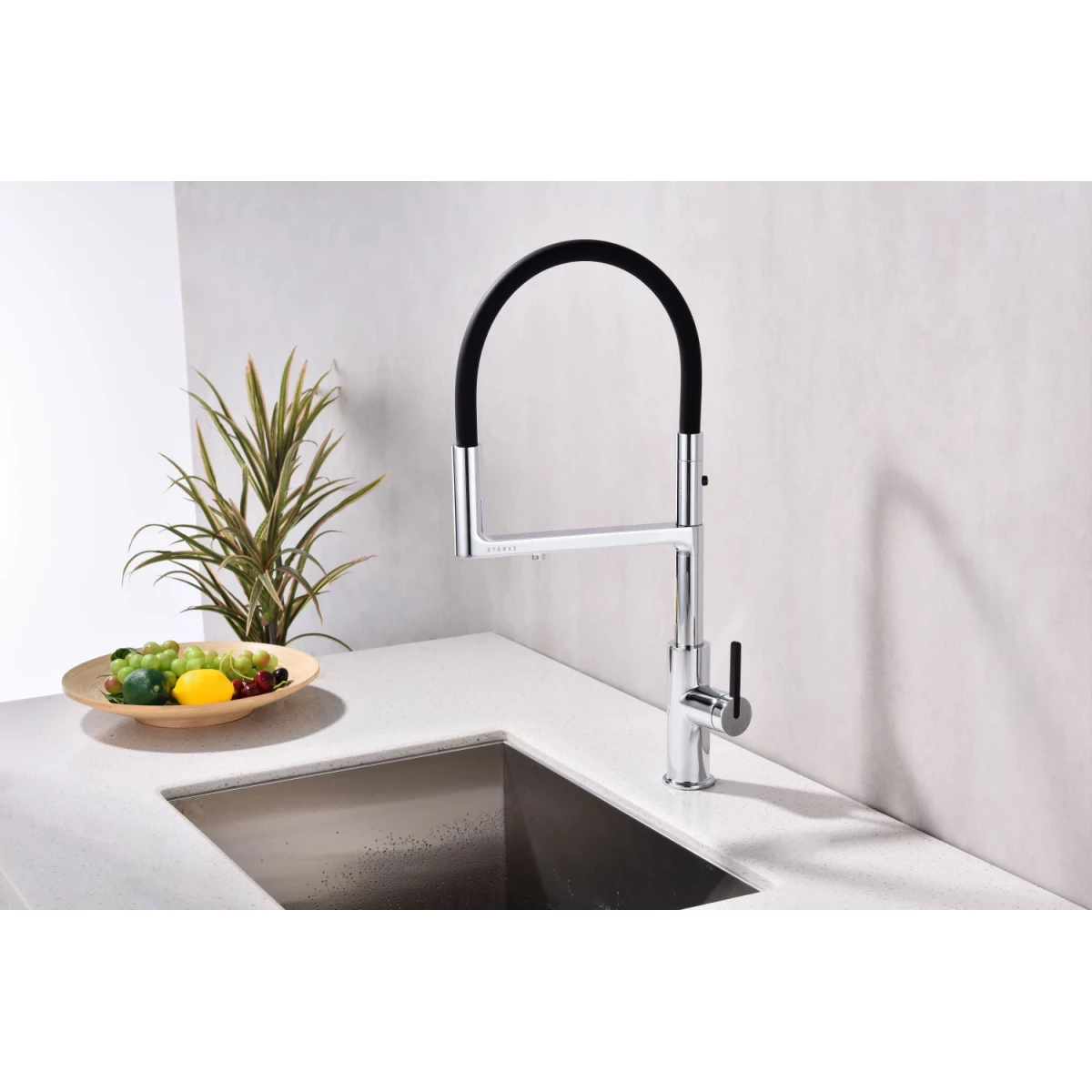 Гибкий силиконовый излив оснащен функцией деликатного душа и магнитным механизмом фиксации в задней части латунного корпуса. Он позволяет ополоснуть посуду или мойку в любой ее части или наполнить емкости даже на столе рядом с мойкой.