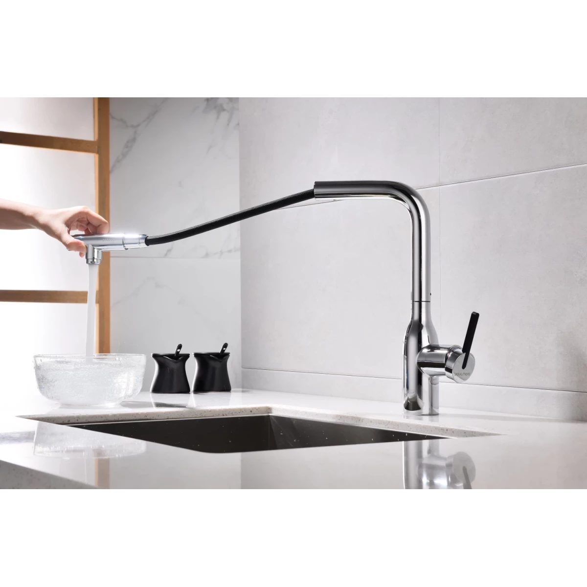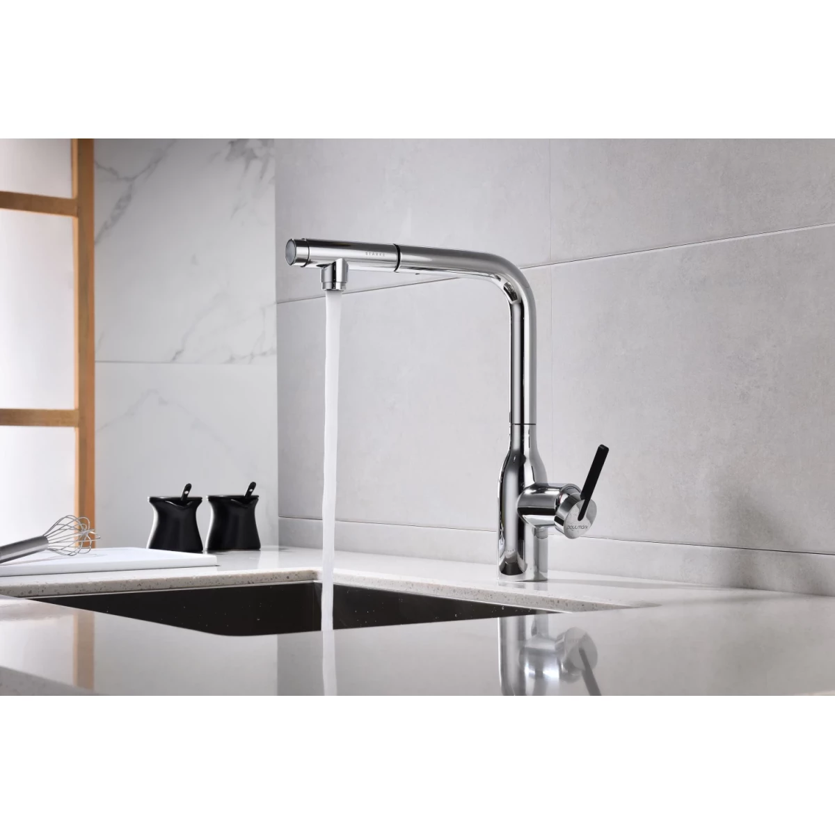 Высокий Г-образный излив с функцией вращения на 360 градусов обеспечивает удобство использования. Выдвижная часть излива способна обеспечить максимально комфортную эксплуатацию и экономный расход воды.