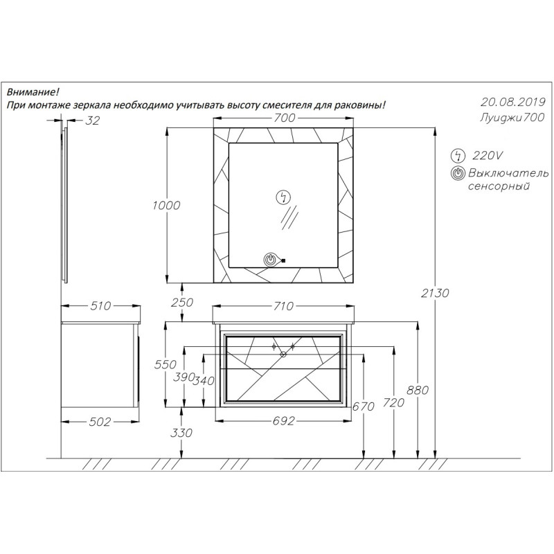 Зеркало с сенсорным выключателем таинственной подсветки по периметру обрамлено в едином стиле с тумбой и также имеет оригинальную гравировку